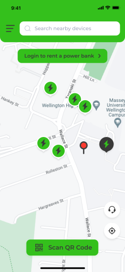 1. Find charging stations – Use our app to find the nearestcharging stations and scan the QR code to unlock your power bank.